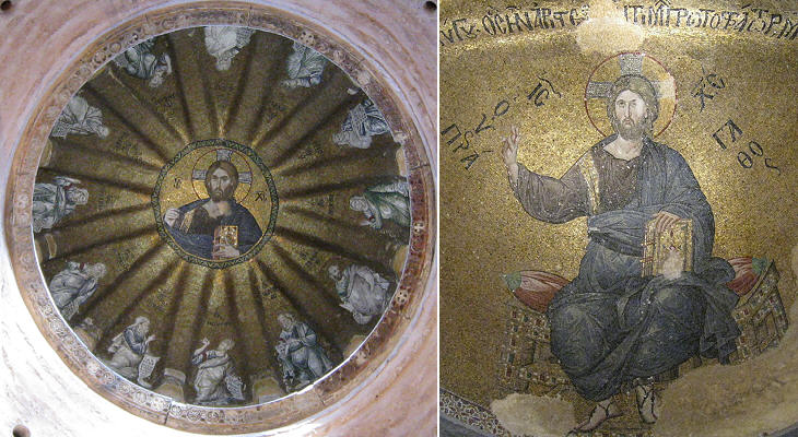 Fethiye Camii - Parecclesion: (left) dome: Christ Pantocrator (Almighty) surrounded by twelve prophets; (right) apse; Christ Hyperagathos (good beyond measure)