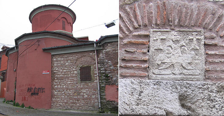 (left) St. Mary of the Mongols; (right) relief on its gate showing the heraldic symbol of the Palaeologus