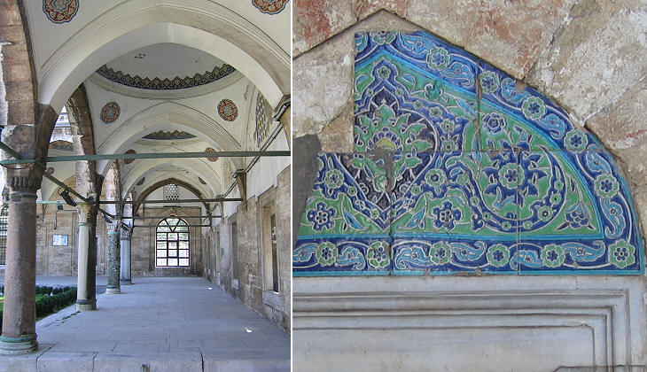 Kara Ahmet Pacha Camii: (left) courtyard; (right) "cuerda seca" tile