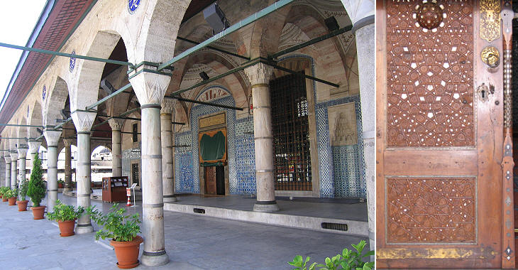 Rustem Pacha Camii: (left) double porch; (right) detail of a door