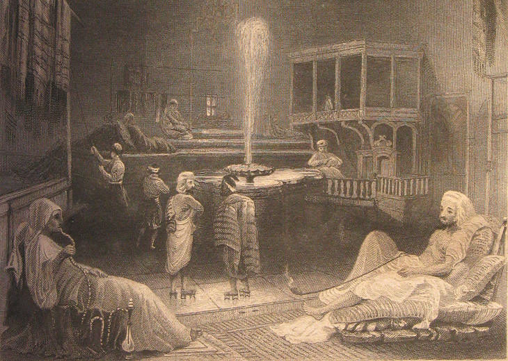 Etching by W. H. Bartlett (1809-1854) showing the cold room of a hammam; bathers wear "takatuka" the clogs used in hammams to avoid slipping