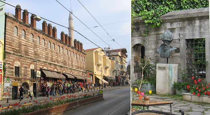 (left) Cafer Aga aka Soguk Kuyu (cold well) Medresesi; (right) bust of Mimar Sinan in its courtyard