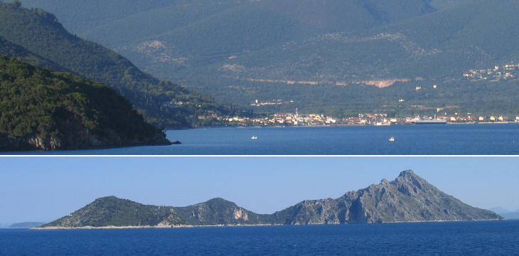 (above) Bay of Samos in Cefalonia; (below) Oxia Island (Isole Curzolari)