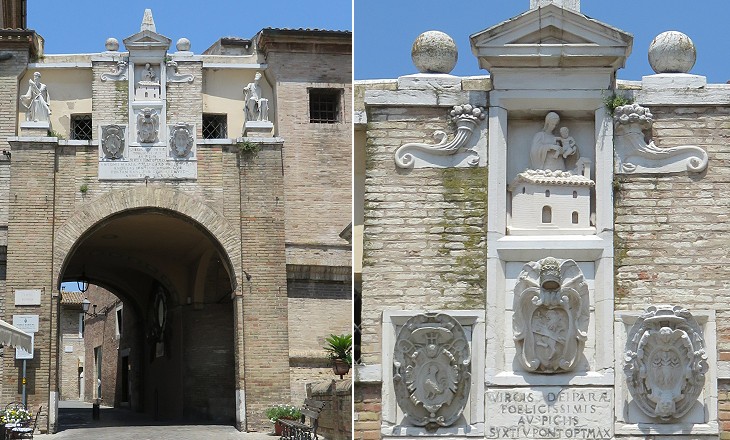 The usual access to Piazza della Madonna is through Corso Boccalini, a street starting at Porta Romana and entering the square at its south-western corner. A more spectacular approach to the square is via the western portal of Palazzo Apostolico. It bears the name of Cardinal Filippo Guastavillani, nephew of Pope Gregory XIII and Protector of the Holy House in 1580-1587. At that time the fountain, the bell tower, the statue of Pope Sixtus V and the façade were yet to be built, but one would think the contrary because the portal frames them perfectly.