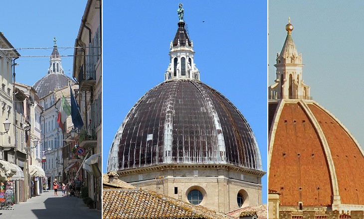 (left) Corso Boccalini, the main street of Loreto; (centre) dome of the Basilica; (right) dome of S. Maria del Fiore in Florence