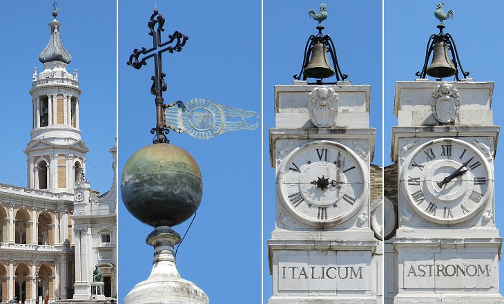 (left to right) Bell tower designed by Luigi Vanvitelli (1750); weathervane at the top of the bell tower showing the Holy House; clock indicating the "Italian Hour" and above it coat of arms of Pope Benedict XIV; clock indicating the astronomical hour and coat of arms of Pope Clement VIII (the cocks on top of the bells are the heraldic symbols of Cardinal Galli)