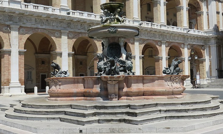 Developments at Loreto were often prompted by those occurring in Rome. In 1612 Pope Paul V celebrated the completion of an aqueduct which carried water to the western part of Rome by building Acqua Paola, a gigantic fountain. In 1614 the completion of an aqueduct carrying water to Loreto was celebrated with a large fountain at the centre of the town. Its shape based on sections of circles and squares and the use of coloured marbles can be seen in many Roman fountains (e.g. Fontana del Pantheon).