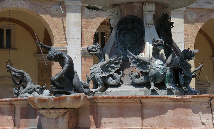 The bronze decorations were added at a later period. They included eagles and dragons, the heraldic symbol of Pope Paul V. The statues were made by Tarquinio and Pietro Paolo Iacometti who worked at the Baptistery of Osimo. Another of their statues can be seen in the image used as background for this page. Perhaps Georg Raphael Donner saw it during his stay in Italy in 1715 and had it in mind when in 1737 he made a statue having the same subject for a fountain in Vienna.