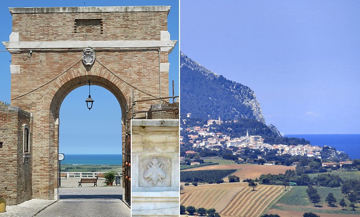 (left) Porta Marina; (right) view towards Mt. Conero and the Adriatic Sea; (inset) a bee, heraldic symbol of Pope Urban VIII