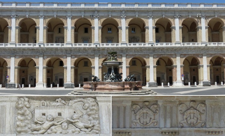 Hippodamus of Mileto is regarded as the father of town planning for having suggested a grid design for the development of Piraeus, the port of Athens. The ancient Romans developed a pattern for the towns they founded which was based on that of castra, their military camps. In the XVth century the importance of town planning (Ideal City) was revived by Leon Battista Alberti and other architects. Symmetry and proportions based on mathematical formulas (e.g. golden ratio, harmonious proportion) were key elements of the Ideal City. These principles influenced the design of Piazza della Madonna which should have been surrounded on three sides by Palazzo Apostolico (but the southern side was never built). You may wish to see the courtyard of Palazzo della Sapienza in Rome which resembles Piazza della Madonna with the church on the eastern side of a rectangle and double porticoes on the other three sides.