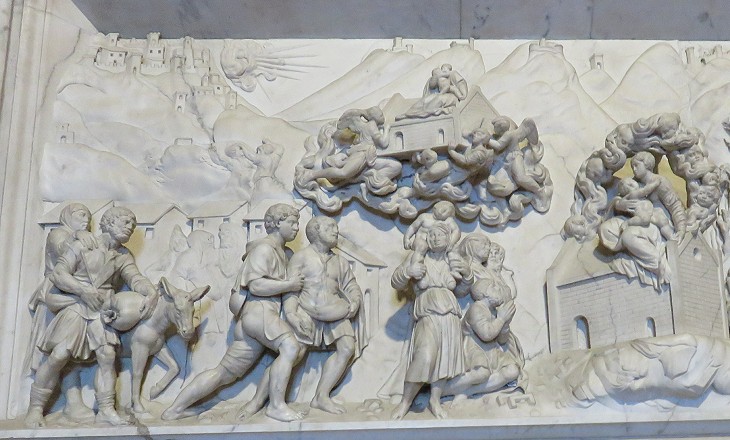 Basilica della Santa Casa: relief by Nicolò Tribolo (ca 1530) depicting angels carrying the Holy House of the Virgin Mary from Nazareth to Loreto