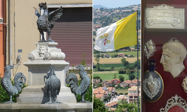 (left) Fontana dei Galli by the Iacometti brothers; (centre) Papal flag; (right) ex-votos