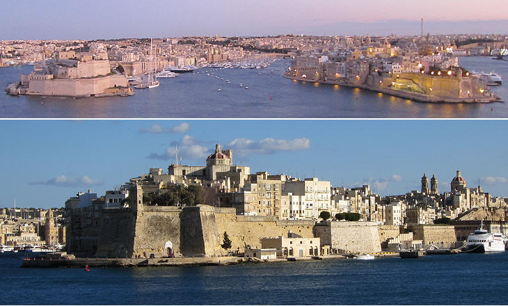 (above) Borgo with Fort S. Angelo (left), Porto delle Galere (centre) and Senglea (right) seen from Valletta; (below) Senglea seen from Valletta