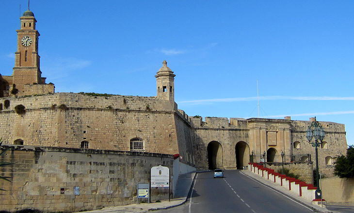 The fortifications which were built at the tip of Isola after the Great Siege were not as impressive as those of Fort S. Angelo; they were in part demolished during the British rule to make room for more dockyards. Yet they attract visitors because of a vedette, a sentry box positioned beyond the walls in order to have a commanding view over all the other fortifications (the inscription above the entrance states pluribus arcibus adstans - opposite many fortresses).