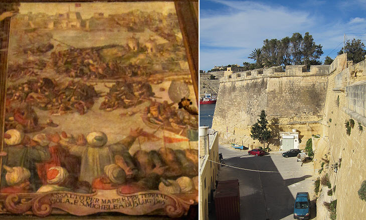 (left) Fresco by Matteo Perez d'Aleccio in the Grand Masters Palace at Valletta showing the Ottoman assault on Isola by land and sea on July 15, 1565. The fresco shows the chain between the two peninsulas which prevented Ottoman ships from entering Porto delle Galere and the palisade built by the Knights at the last minute at Isola; (right) walls at the tip of Isola which replaced the palisade