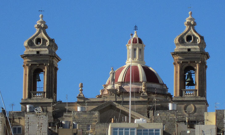 The main church of Senglea was built in the XVIIth century, but it was modified significantly in the two following centuries. Eventually it was almost totally destroyed during WWII by Italian/German bombings. Its design resembles that of many Roman churches; when it comes to the colour of domes however at Malta they had a liking for S. Maria del Fiore in Florence, rather than for S. Pietro in Rome.