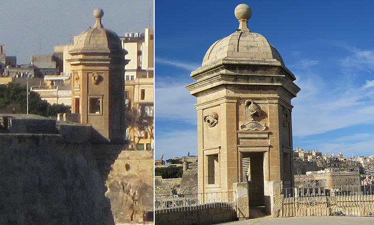 Gardjola (sentry box): (left) seen from Fort S. Angelo; (right) at close range with Valletta in the background