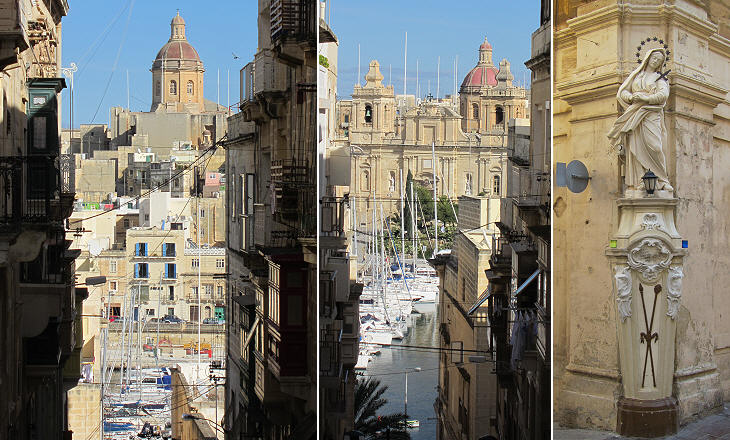 (left/centre) Views of Dockyard Creek and Borgo churches (left: the Annunciation; right: St. Lawrence's) from the main street of Senglea; (right) a tabernacle in the main street