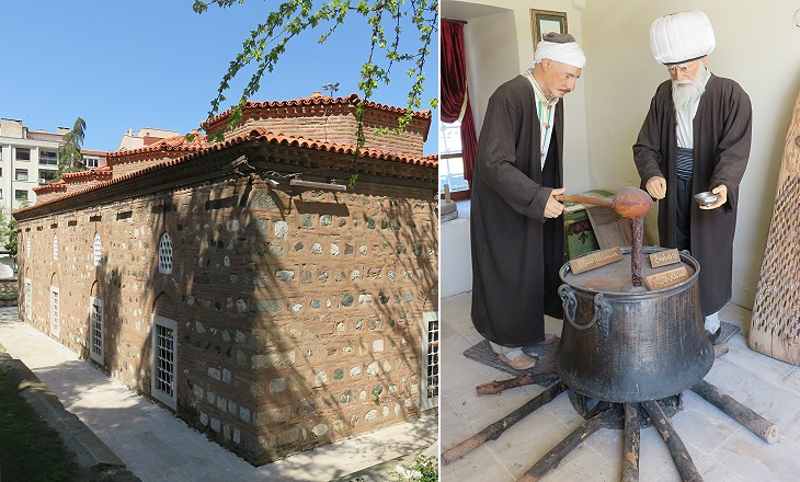 (left) Sultan Kulliyesi Darussifah; (right) a room of the Medical History Exhibition housed in the building. It shows the preparation of Mesir Paste, a medicament based on more than thirty herbs and spices, which is said to be an aphrodisiac. You may wish to see the beautiful darussifah of Ikinci Beyazit Kulliye at Edirne