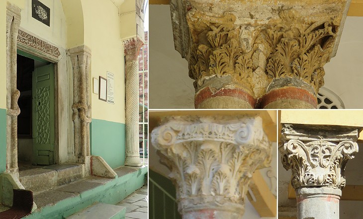Ulu Cami: (left) entrance to Ishak Celebi Turbesi (mausoleum) between the mosque and the medrese; (right) ancient capitals in the courtyards of the mosque and of the medrese