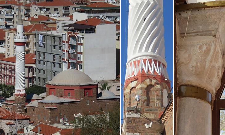 (left) Hatuniye Camii (1490, but much reconstructed after the 1922 fire); (centre) base of the minaret; (right) ancient capital in the porch with a cross as decorative motif; another detail is shown in the image used as background for this page