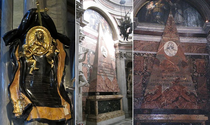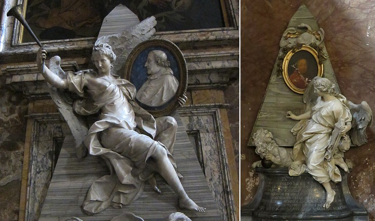 Monuments designed by Gian Lorenzo Bernini: (left) to Maria Raggi (1647) in S. Maria sopra Minerva; (centre/right) to Sigismondo and Agostino Chigi (1652) in Cappella Chigi in S. Maria del Popolo