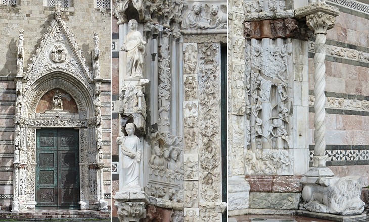 The main portal of the Cathedral was built and decorated over a period of time which spans from the XIVth to the XVIth century so it has features of different styles. The sculptors who most likely were involved in its decoration came from Tuscany and Lombardy, an indication that Messina had stronger ties with the Italian peninsula than other towns of Sicily. The two lions holding a column most likely were there already in the XIIth century (see those at S. Lorenzo fuori le Mura in Rome).