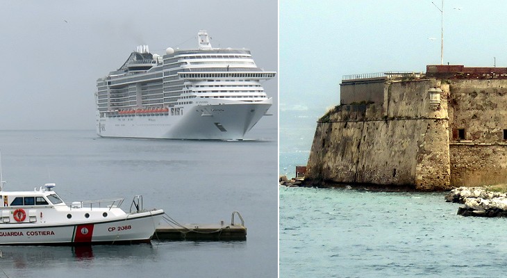 (left) MSC Splendida, a giant cruise boat with a capacity of 3,900 passengers, on its way to the harbour of Messina; (right) a remaining bastion of the fortresses which protected the harbour