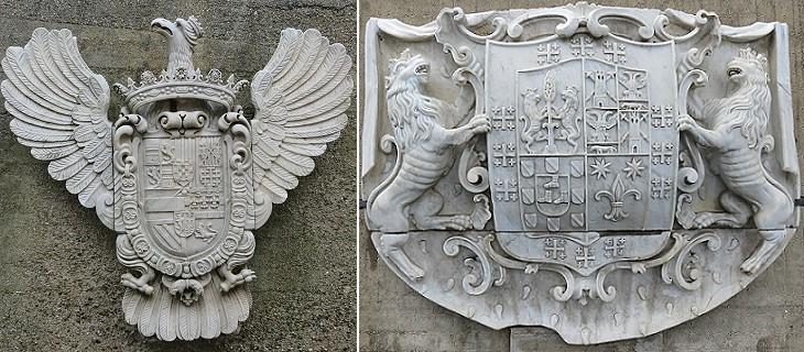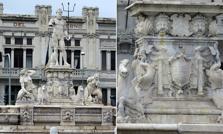 (left) Fontana di Nettuno; (right) coat of arms of Emperor Charles V. Notice the two columns at its sides, they represent the Pillars of Hercules (Strait of Gibraltar) and bear the inscription "Plus Ultra" (Further Beyond) indicating that Charles' empire spanned beyond them
