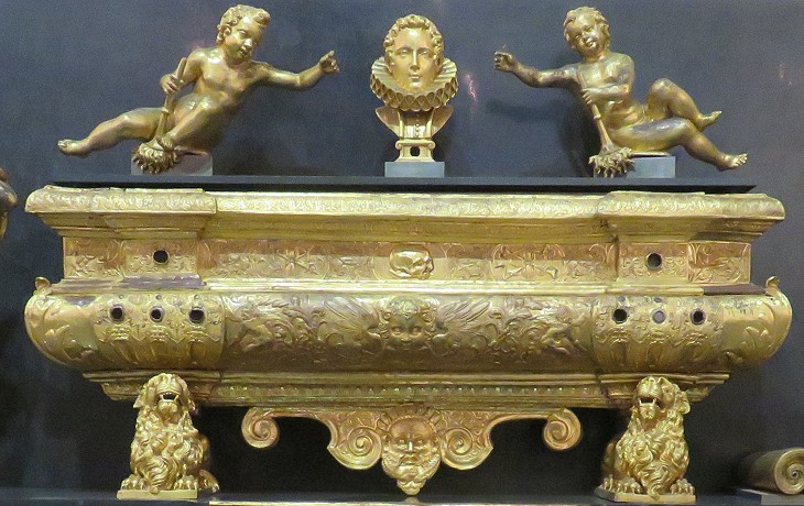 The churches of Messina housed many funerary monuments. A few of them escaped destruction and were moved to the museum. Some minor parts of the bronze monument to Francesca Lanza Cybo are missing. She passed away aetatis flore at the age of 15 in 1618. She belonged to the Cybo family, that of Pope Innocent VIII (see their funerary chapel in Rome). The designer of the monument is unknown, perhaps a member of the Calamech family.