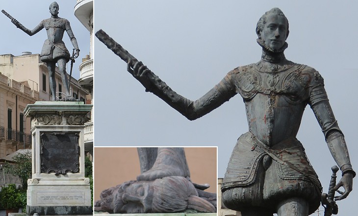 1572 Monument to Don Juan of Austria by Andrea Calamech, a sculptor from Tuscany; (inset) head of Ali Pacha, commander of the Ottoman Fleet at the Battle of Lepanto