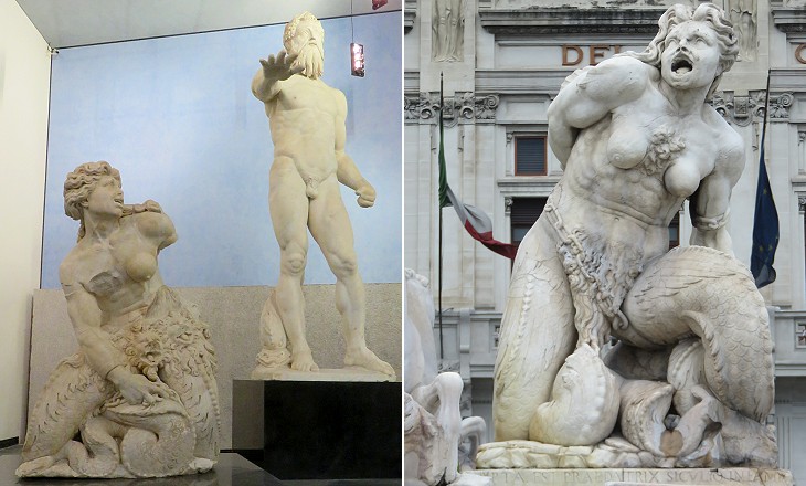 (left) Museo Regionale di Messina: original statues of Neptune and Scylla; (right) Charybdis