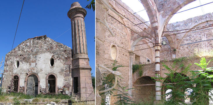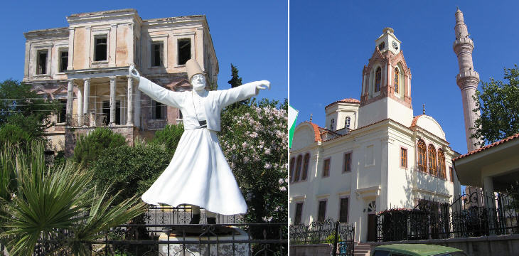 An old Greek villa in Cunda and a church turned into a mosque in Ayvalik (the statue portraying a whirling dervish is a modern addition meant to give a Turkish flavour to Cunda; see a similar one at Kutahya)