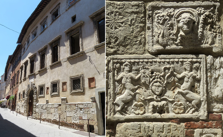 (left) Palazzo Bucelli (along the Corso); (right) some of the inscriptions and reliefs which decorate it: that depicting female centaurs is identical to that of a cinerary urn at Chiusi