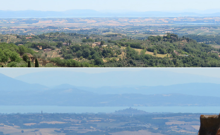 (above) View towards Lake Trasimeno and the lake of Montepulciano; (below) Castiglione del Lago