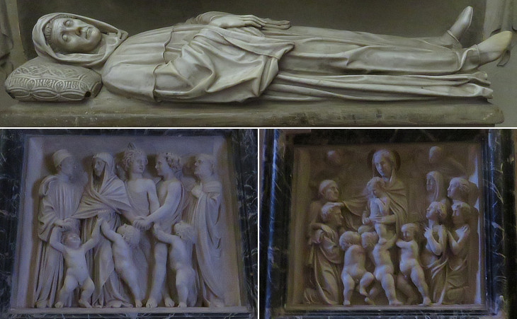 Cathedral: (above) Dismantled funerary monument of Bartolomeo Aragazzi; (below) reliefs from the monument: (left) Aragazzi meets his relatives in Heaven; (right) the Virgin Mary blesses him