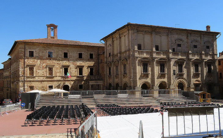 Montepulciano is an entirely mediaeval city. (..) It is one of the cleanest and handsomest of the completely hill-set towns. Its broad streets are well paved and contain many old palaces. (..) At the top of all is the piazza, with the unfinished Cathedral, the handsome machicolated Palazzo Pubblico, another old palace, and a well. Hare