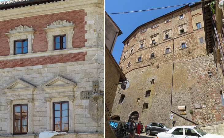 Palazzo Contucci Del Monte; (left) side on Piazza Grande opposite Palazzo Comunale with a coat of arms of Cardinal Antonio Maria Ciocchi del Monte or of his nephew Cardinal Giovanni Maria Ciocchi del Monte (Pope Julius III in 1550); (right) rear side from the Corso