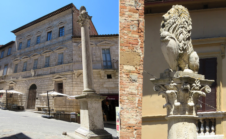 (left) Palazzo Avignonesi and Colonna del Marzocco; (right) the Lion, symbol of Florence; it was placed also on a well in Piazza Grande; the column calls to mind those which the Venetians placed in Piazza S. Marco and in many towns of their Republic, e.g. at Chioggia