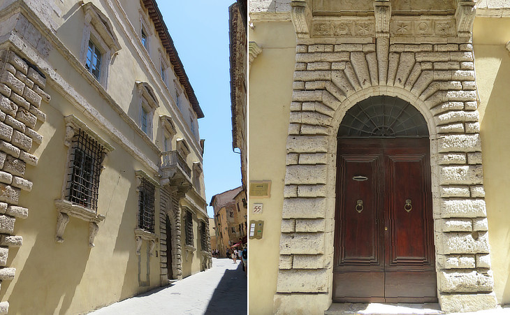(left) Casa del Poliziano along the Corso; (right) Palazzo Bombagli Neri-Orselli (in Via Ricci); Siena has many Gothic red brick buildings which might have influenced the design of the palace
