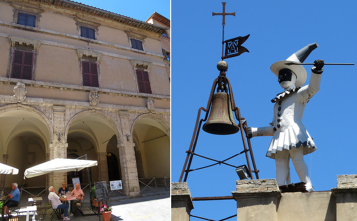 (left) Logge del Grano; (right) "Pulcinella" metal-and-wood figure which strikes the hour at the top of a tower near Logge del Grano (late XVIIth century)