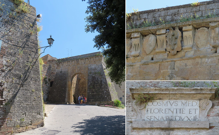 (left) Porta al Prato; (right-above) coat of arms of the Medici; (right-below) inscription celebrating Cosimo I as Duke of Florence and Siena on the bastion protecting the gate (ca 1559)