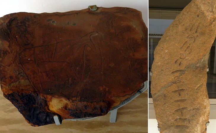 Archaeological Museum of Rabat: (left) rock carvings; (right) inscription in Libyan alphabet (you may wish to see a bilingual inscription in Libyan and Punic alphabets - it opens in another window - from Thugga)