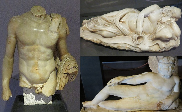 Archaeological Museum of Rabat: marble statues from Volubilis: (left) perhaps an emperor or a local magistrate in heroic nudity (see similar statues in Italy and Turkey); (right-above) an old drunken satyr (see a similar statue from Herculaneum); (right-below) another satyr