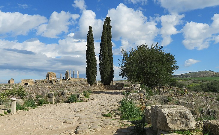 Volubilis: a paved street in the southern part of the town and the area of the Forum in the background