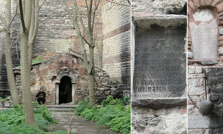 (left) A IVth century AD tomb between the inner and the outer walls at Silivri Kapi; (right) Greek inscriptions celebrating repairs made in the XIth and XVth centuries and an Ottoman iron ball next to the gate