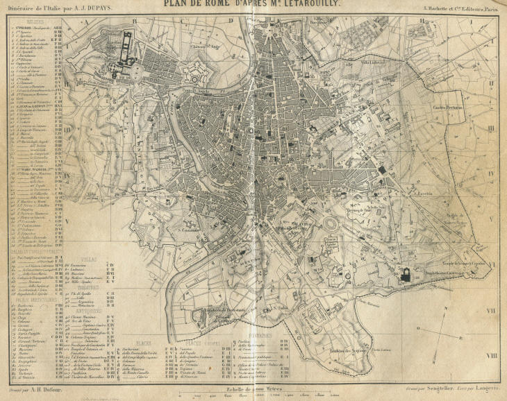 This map of Rome was included in an 1852 French Guide to Rome and it is based on a larger 1841 map by Paul-Marie Letarouilly (*); it shows Rome as it was before the development of railway and the 1870 annexation to the Kingdom of Italy; because it shows Rome in the last years of the Papal government, it is very useful to locate the monuments which house the papal coats of arms listed in the catalogue.