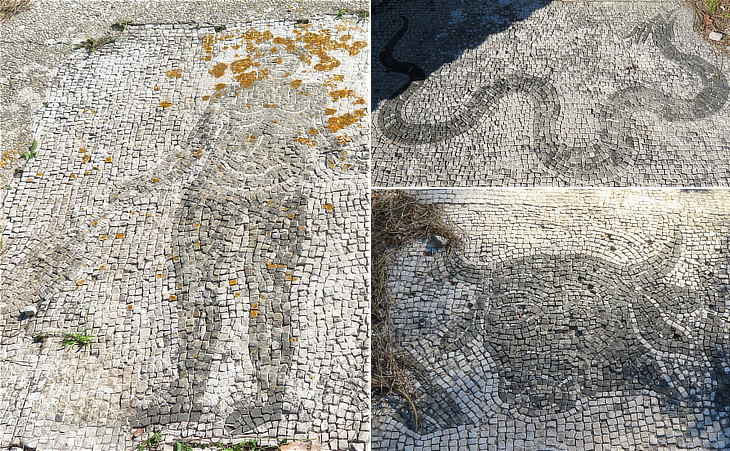 Mithraeum of the Animals: details of its floor mosaic depicting: (left) Cautopates holding a burning torch pointed down; (right-above) a snake, one of the initiation grades; (right-below) a bull