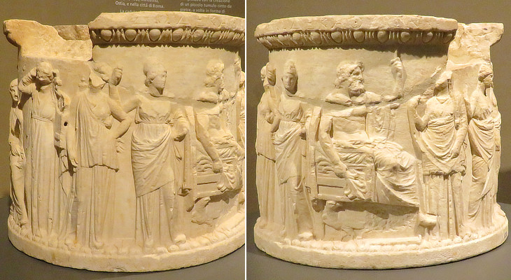 This may explain the presence of priestesses at the Magna Mater temple. Metilia Acte was the wife of an important man and she was defined as sanctissima (holiest) so we may assume she was a high priestess. The relief portrays events associated with the myth of Admetus and Alcestis, who loved each other so much that Alcestis was brought back to the mortal world by the intervention of Hercules or Persephone (learn more about this tale).
