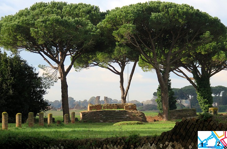 Tempio della Magna Mater (Great Mother) and remains of brick columns of a porch leading to it; in the far distance two pillars of Terme di Porta Marina; (inset) plan of the monuments covered in this page: 1) Tempio della Magna Mater; 2) Santuario di Attis